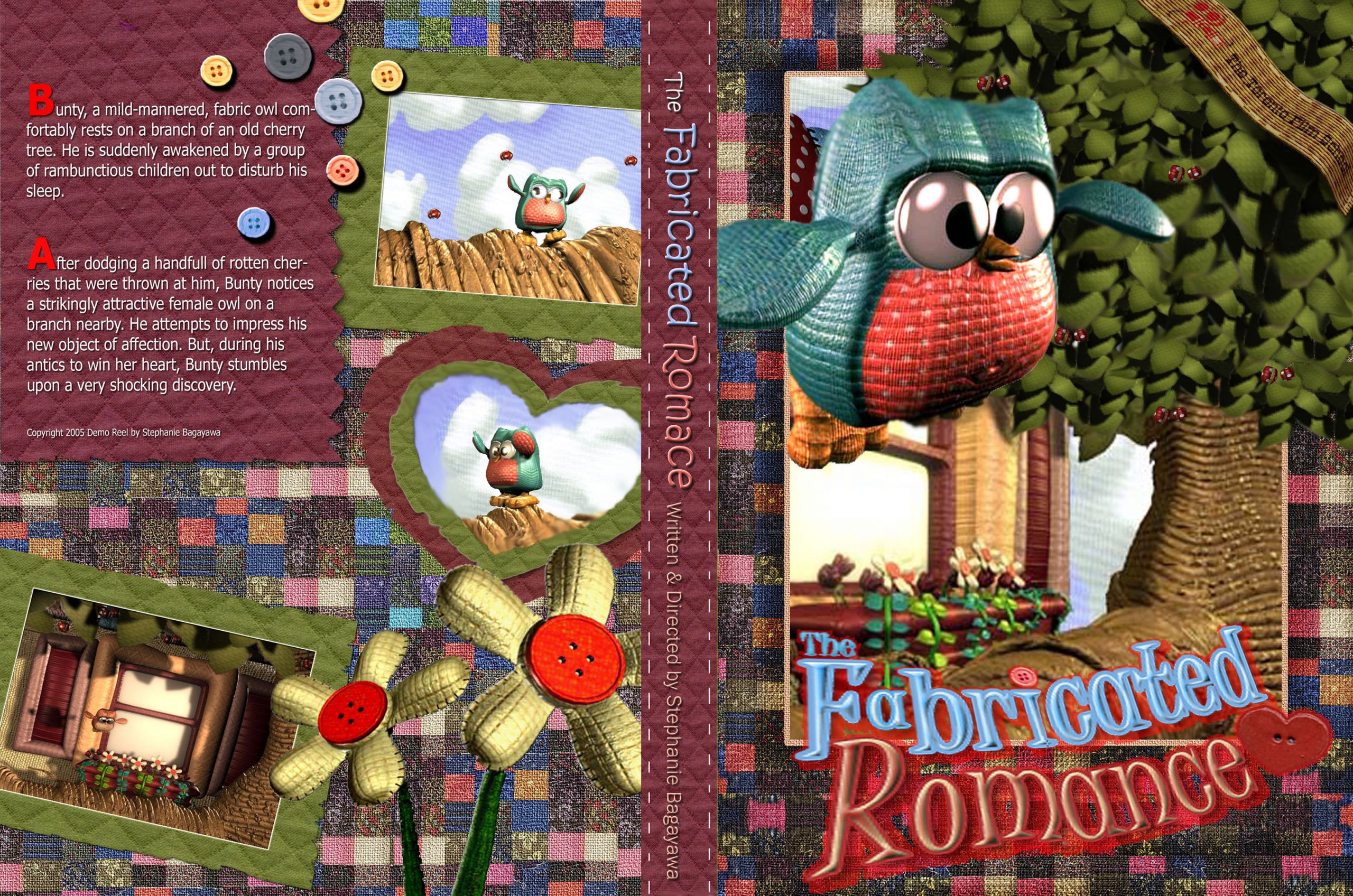 A 3D animation I created from concept to final production. The story is set in a world where everything is made of quilted fabric, and it follows the journey of Bunty the owl who falls in love with an attractive pink owl. However, his attempts to win her heart lead him to a shocking discovery.